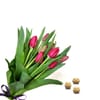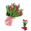 Different size of tulips stems to choose from 10 stems of tulips 20 stems of dark Pink Tulips wrapped in a florist choice violin wrapping with a 3 Pack Ferraro Rocher chocolate. The Deluxe size will comes with a three bunches of tulips and a seasonal greenery. Wrapped as pictured